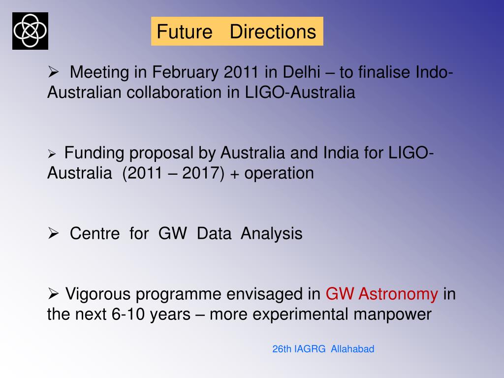 Future Directions • Meeting in February 2011 in Delhi – to finalise Indo- Australian collaboration in LIGO-Australia • Funding proposal by Australia and India for LIGO- Australia (2011 – 2017) + operation • Centre for GW Data Analysis • Vigorous programme envisaged in GW Astronomy in the next 6-10 years – more experimental manpower 26th IAGRG Allahabad