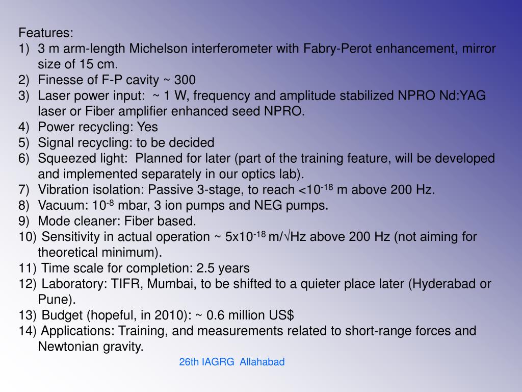 Features: • 3 m arm-length Michelson interferometer with Fabry-Perot enhancement, mirror size of 15 cm. • Finesse of F-P cavity ~ 300 • Laser power input: ~ 1 W, frequency and amplitude stabilized NPRO Nd:YAG laser or Fiber amplifier enhanced seed NPRO. • Power recycling: Yes • Signal recycling: to be decided • Squeezed light: Planned for later (part of the training feature, will be developed and implemented separately in our optics lab). • Vibration isolation: Passive 3-stage, to reach <10-18 m above 200 Hz. • Vacuum: 10-8 mbar, 3 ion pumps and NEG pumps. • Mode cleaner: Fiber based. • Sensitivity in actual operation ~ 5x10-18 m/√Hz above 200 Hz (not aiming for theoretical minimum). • Time scale for completion: 2.5 years • Laboratory: TIFR, Mumbai, to be shifted to a quieter place later (Hyderabad or Pune). • Budget (hopeful, in 2010): ~ 0.6 million US$ • Applications: Training, and measurements related to short-range forces and Newtonian gravity. 26th IAGRG Allahabad