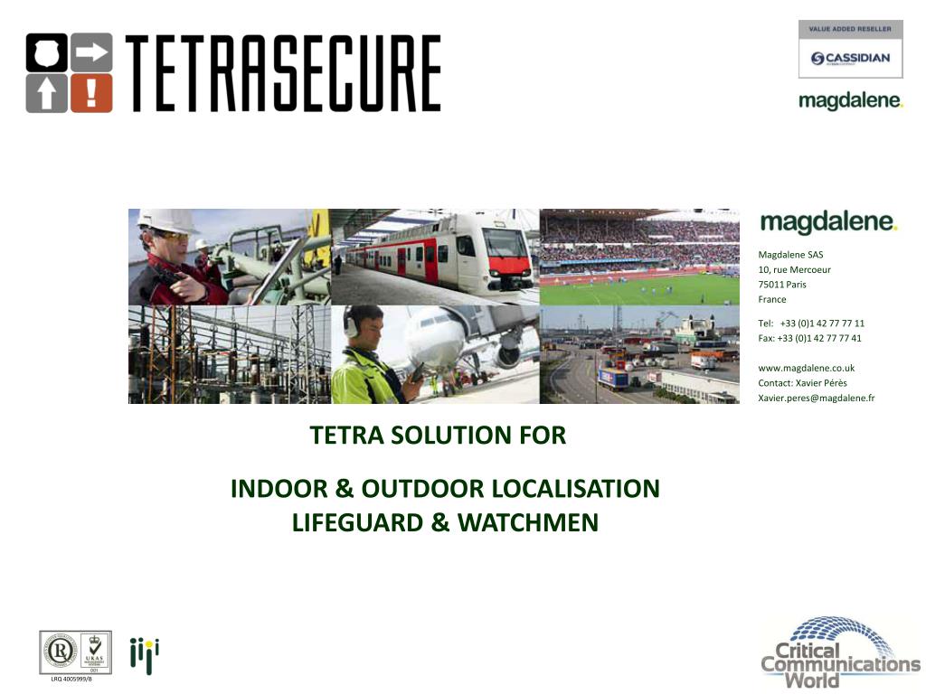 Magdalene SAS 10, rue Mercoeur 75011 Paris France Tel: +33 (0)1 42 77 77 11 Fax: +33 (0)1 42 77 77 41 www.magdalene.co.uk Contact: Xavier Pérès Xavier.peres@magdalene.fr . TETRA SOLUTION FOR. INDOOR & OUTDOOR LOCALISATION LIFEGUARD & WATCHMEN. LRQ 4005999/B.