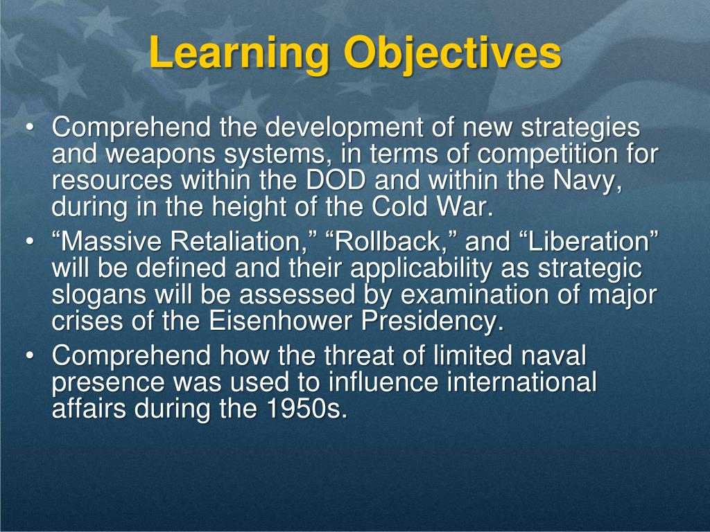 Learning Objectives • Comprehend the development of new strategies and weapons systems, in terms of competition for resources within the DOD and within the Navy, during in the height of the Cold War. • “Massive Retaliation,” “Rollback,” and “Liberation” will be defined and their applicability as strategic slogans will be assessed by examination of major crises of the Eisenhower Presidency. • Comprehend how the threat of limited naval presence was used to influence international affairs during the 1950s.