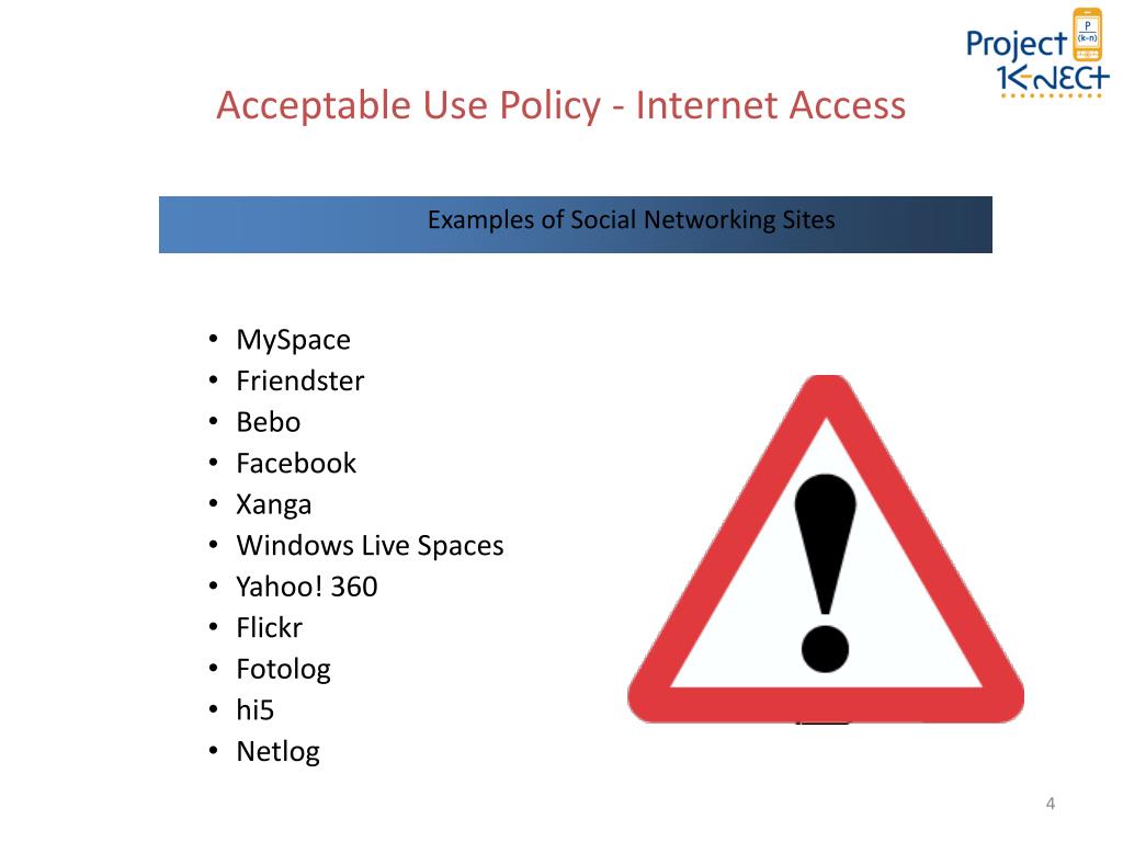 Acceptable Use Policy - Internet Access • MySpace • Friendster • Bebo • Facebook • Xanga • Windows Live Spaces • Yahoo! 360 • Flickr • Fotolog • hi5 • Netlog • Examples of Social Networking Sites