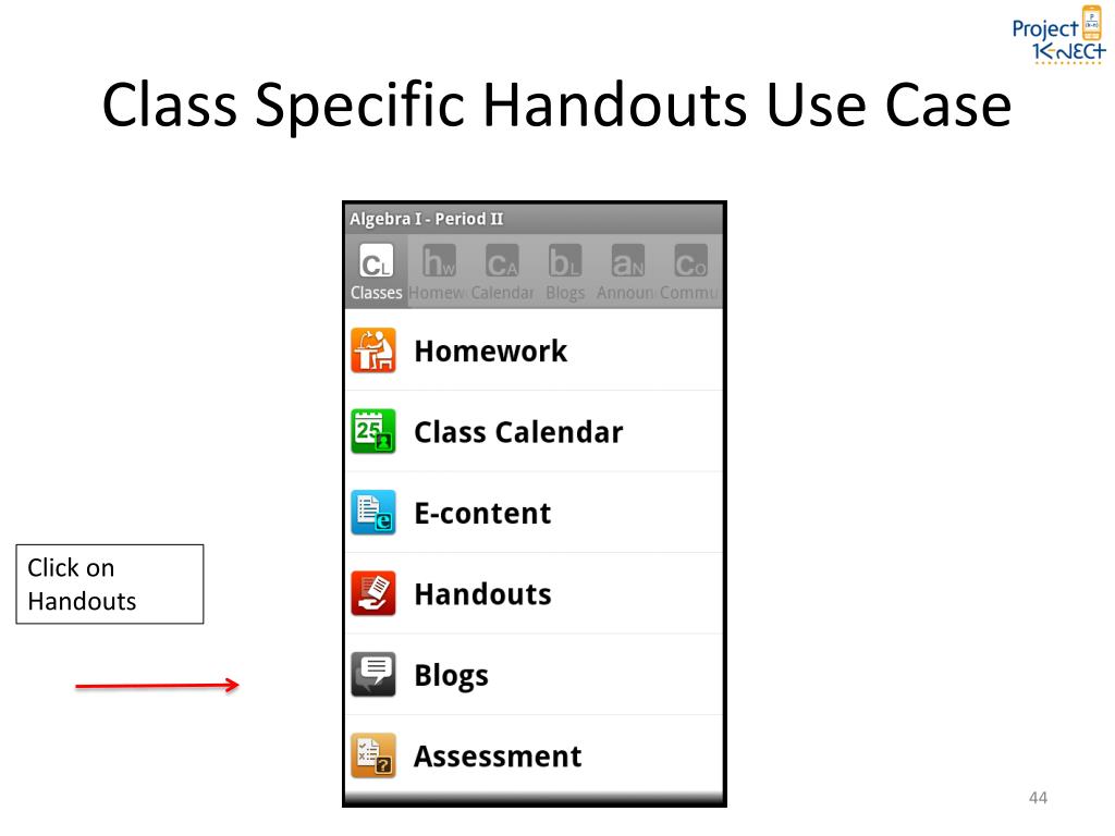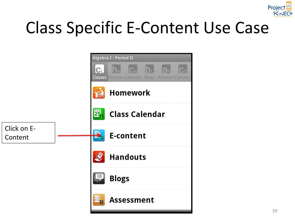 K-Nect App Class Page (Algebra I) Displays only calendar events that are specific to this class. Displays link to content resources that will help students achieve proficiency Displays any specific class handouts provided by the teacher Displays all blogs that are uniquely assigned for the specific class Displays access to any openly assigned assignment tests Provides access to applications that are interactive based tools or other.