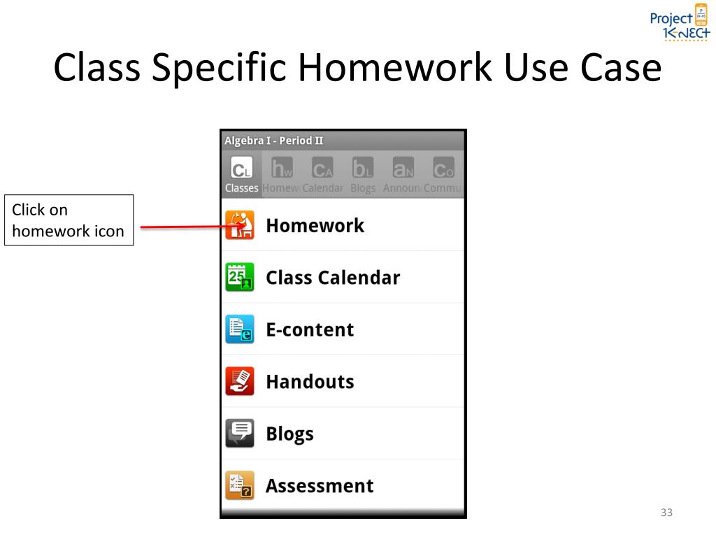K-Nect App Class Page (Algebra I) Displays all assigned homework that is specific to this class Displays only calendar events that are specific to this class. Displays link to content resources that will help students achieve proficiency Displays any specific class handouts provided by the teacher Displays all blogs that are uniquely assigned for the specific class Displays access to any openly assigned assignment tests