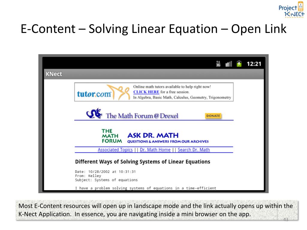 E-Content – Solving Linear Equation – Open Link Most E-Content resources will open up in landscape mode and the link actually opens up within the K-Nect Application. In essence, you are navigating inside a mini browser on the app.