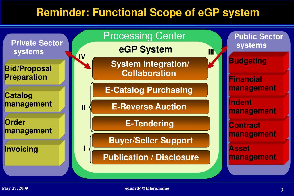 eduardo@talero.name Reminder: Functional Scope of eGP system Budgeting Bid/Proposal Preparation Financial management Indent management Catalog management Contract management Order management Asset management Invoicing Processing Center Public Sector systems Private Sector systems ` eGP System III IV System integration/ Collaboration E-Catalog Purchasing E-Reverse Auction II E-Tendering Buyer/Seller Support I Publication / Disclosure