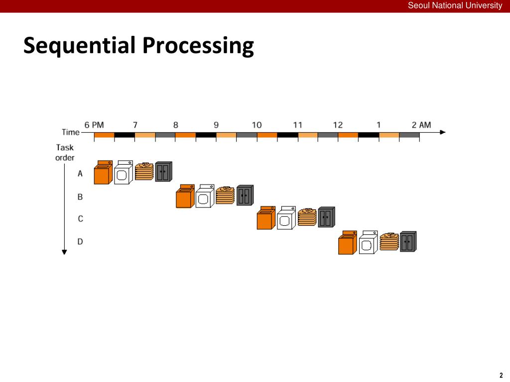 Seoul National University. P ipelining Basics. Seoul National University. Sequential Processing. Seoul National University. Pipelined Processing. Seoul National University. Basic Steps of Execution. 1. Instruction fetch step ( F ) 2. Instruction decode/register fetch step ( D )