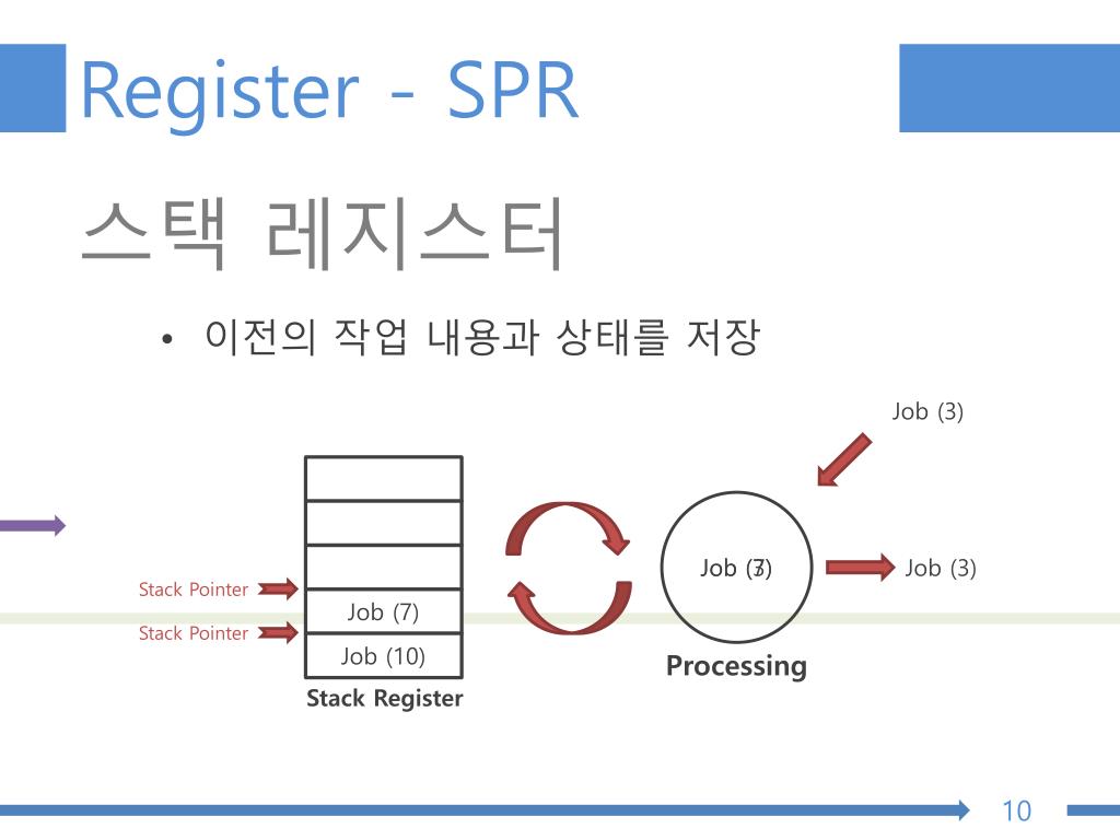 Register - SPR 스택 레지스터 Job (10) • 이전의 작업 내용과 상태를 저장 Processing Job (3) Stack Pointer Stack Pointer Job (3) Job (7) Job (3) Job (7) Stack Register 10