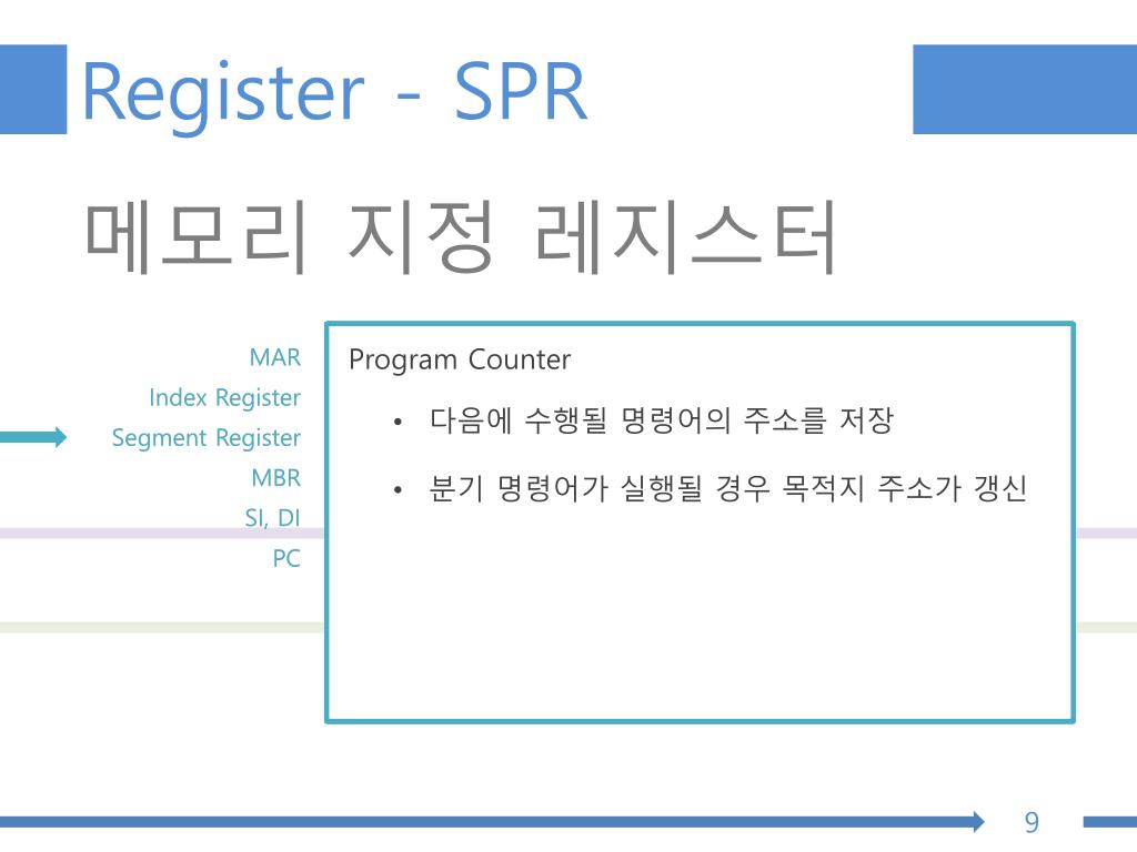 Register - SPR 명령어 레지스터 동작코드 오퍼랜드 • IR(Instruction Register) • 현재 수행중인 명령어 부호를 저장 • Main Memory → Bus Interface Unit →Prefetch Unit → Decode Unit → IR 8