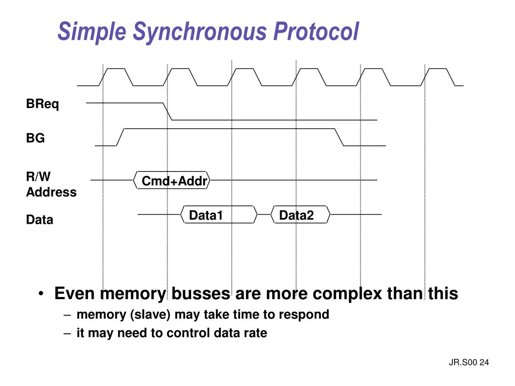 Simple Synchronous Protocol BReq • Even memory busses are more complex than this • memory (slave) may take time to respond • it may need to control data rate BG R/W Address Cmd+Addr Data1 Data2 Data