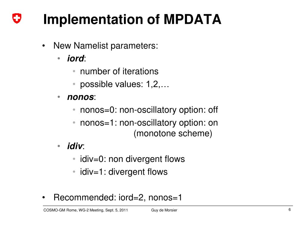 Implementation of MPDATA • New Namelist parameters: • iord: • number of iterations • possible values: 1,2,… • nonos: • nonos=0: non-oscillatory option: off • nonos=1: non-oscillatory option: on (monotone scheme) • idiv: • idiv=0: non divergent flows • idiv=1: divergent flows • Recommended: iord=2, nonos=1
