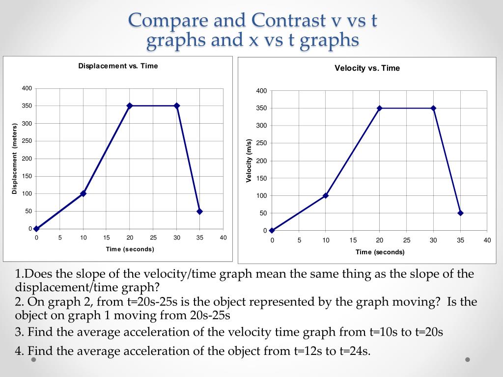 Compare and Contrast v vs t graphs and x vs t graphs 1.Does the slope of the velocity/time graph mean the same thing as the slope of the displacement/time graph? 2. On graph 2, from t=20s-25s is the object represented by the graph moving? Is the object on graph 1 moving from 20s-25s 3. Find the average acceleration of the velocity time graph from t=10s to t=20s 4. Find the average acceleration of the object from t=12s to t=24s.