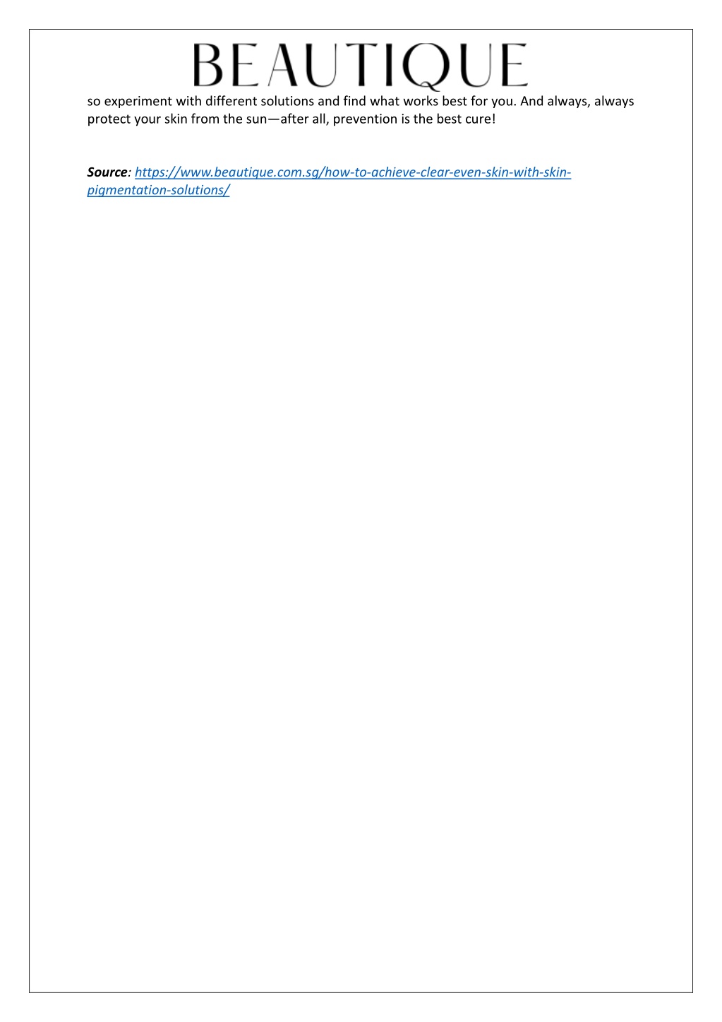 so experiment with different solutions and find what works best for you. And always, always protect your skin from the sun—after all, prevention is the best cure! Source: https://www.beautique.com.sg/how-to-achieve-clear-even-skin-with-skin- pigmentation-solutions/