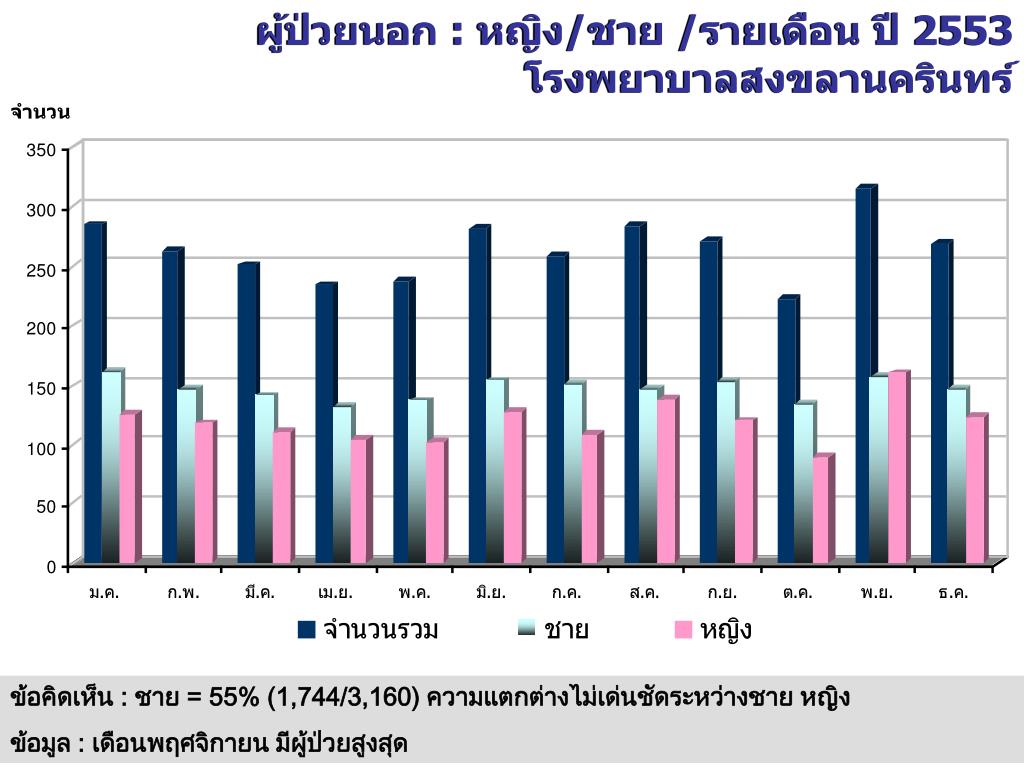 ผู้ป่วยนอก : หญิง/ชาย /รายเดือน ปี 2553 โรงพยาบาลสงขลานครินทร์ จำนวน ข้อคิดเห็น : ชาย = 55% (1,744/3,160) ความแตกต่างไม่เด่นชัดระหว่างชาย หญิง ข้อมูล : เดือนพฤศจิกายน มีผู้ป่วยสูงสุด