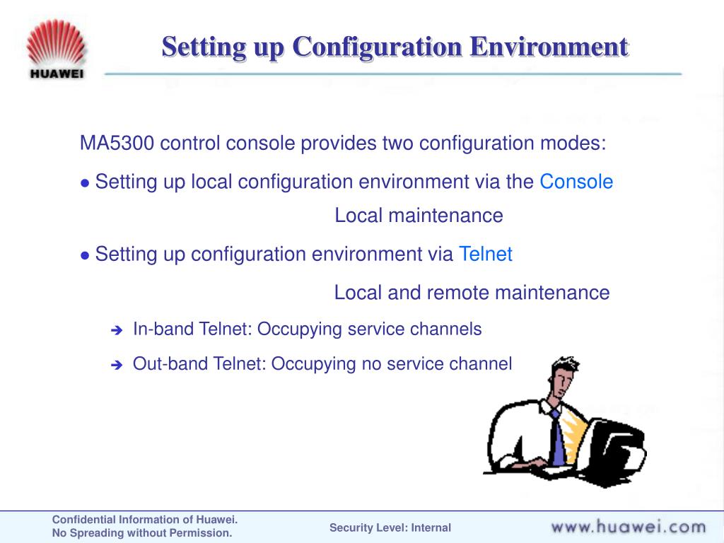 Setting up Configuration Environment MA5300 control console provides two configuration modes: • Setting up local configuration environment via the ConsoleLocal maintenance • Setting up configuration environment via Telnet Local and remote maintenance • In-band Telnet: Occupying service channels • Out-band Telnet: Occupying no service channel Security Level: Internal