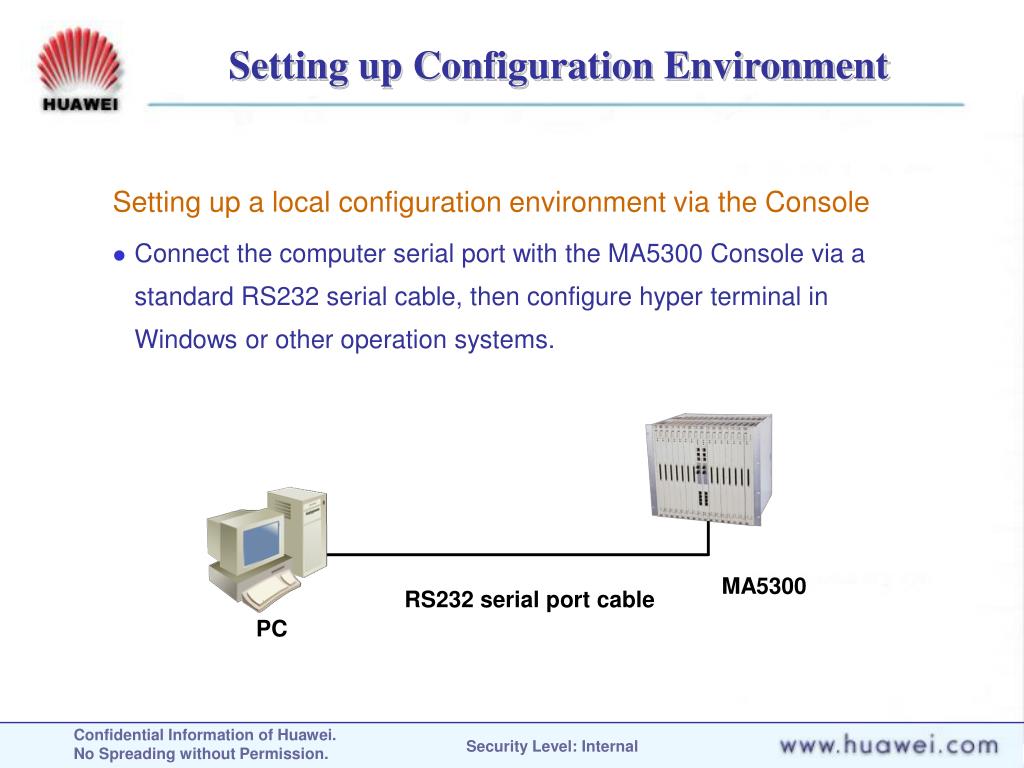 Setting up Configuration Environment Setting up a local configuration environment via the Console • Connect the computer serial port with the MA5300 Console via a standard RS232 serial cable, then configure hyper terminal in Windows or other operation systems. RS232 serial port cable MA5300 PC Security Level: Internal