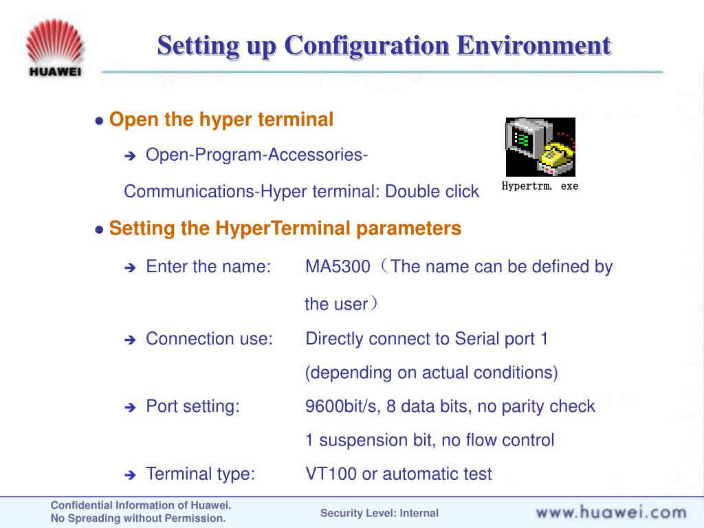 Hypertrm. exe Setting up Configuration Environment • Open the hyper terminal • Open-Program-Accessories- Communications-Hyper terminal: Double click • Setting the HyperTerminal parameters • Enter the name:MA5300(The name can be defined by the user) • Connection use: Directly connect to Serial port 1 (depending on actual conditions) • Port setting: 9600bit/s, 8 data bits, no parity check 1 suspension bit, no flow control • Terminal type: VT100 or automatic test Security Level: Internal