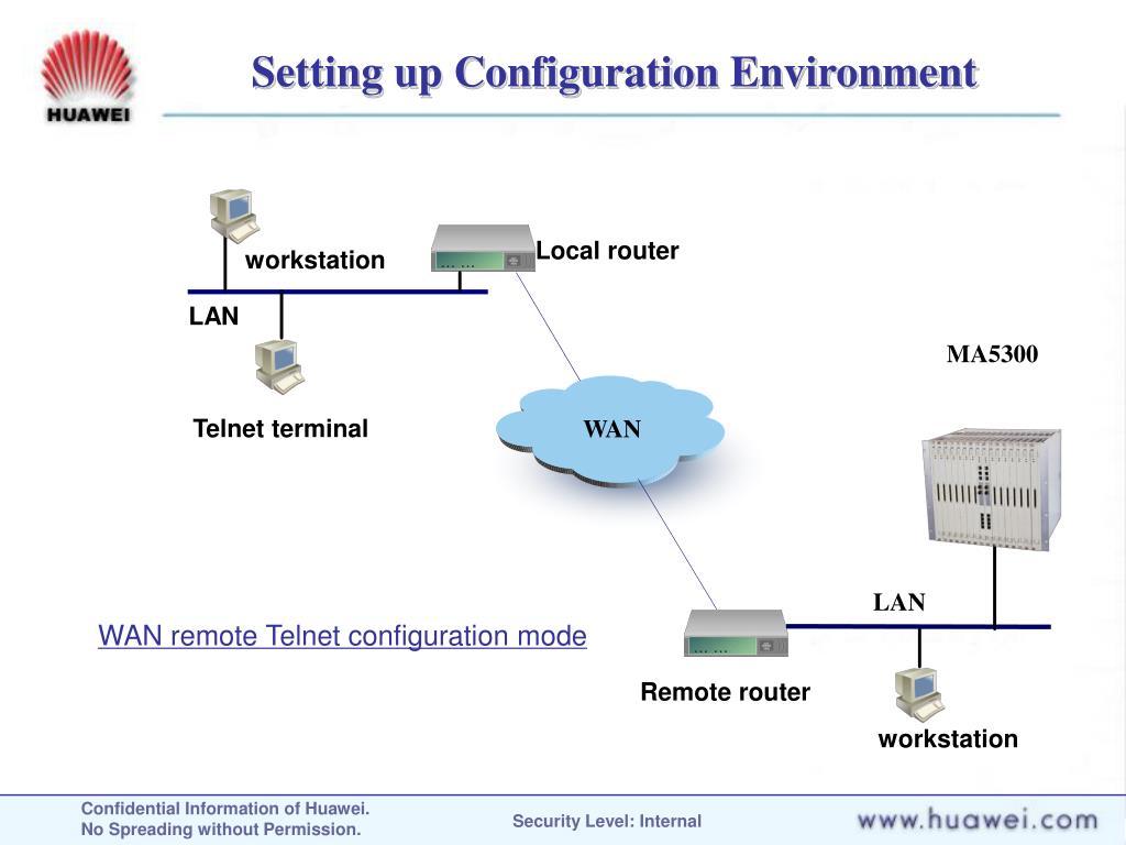 Setting up Configuration Environment Local router workstation LAN MA5300 Telnet terminal WAN LAN WAN remote Telnet configuration mode Remote router workstation Security Level: Internal