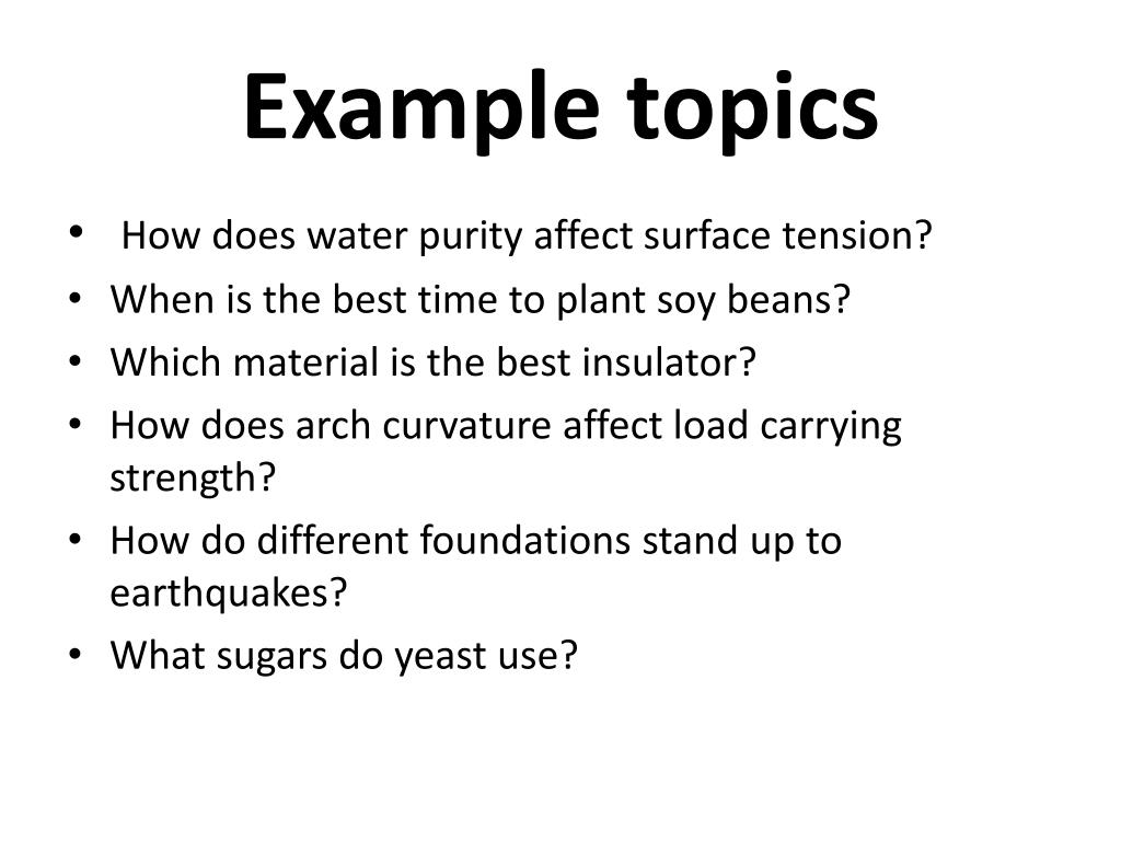 Example topics • How does water purity affect surface tension? • When is the best time to plant soy beans? • Which material is the best insulator? • How does arch curvature affect load carrying strength? • How do different foundations stand up to earthquakes? • What sugars do yeast use?