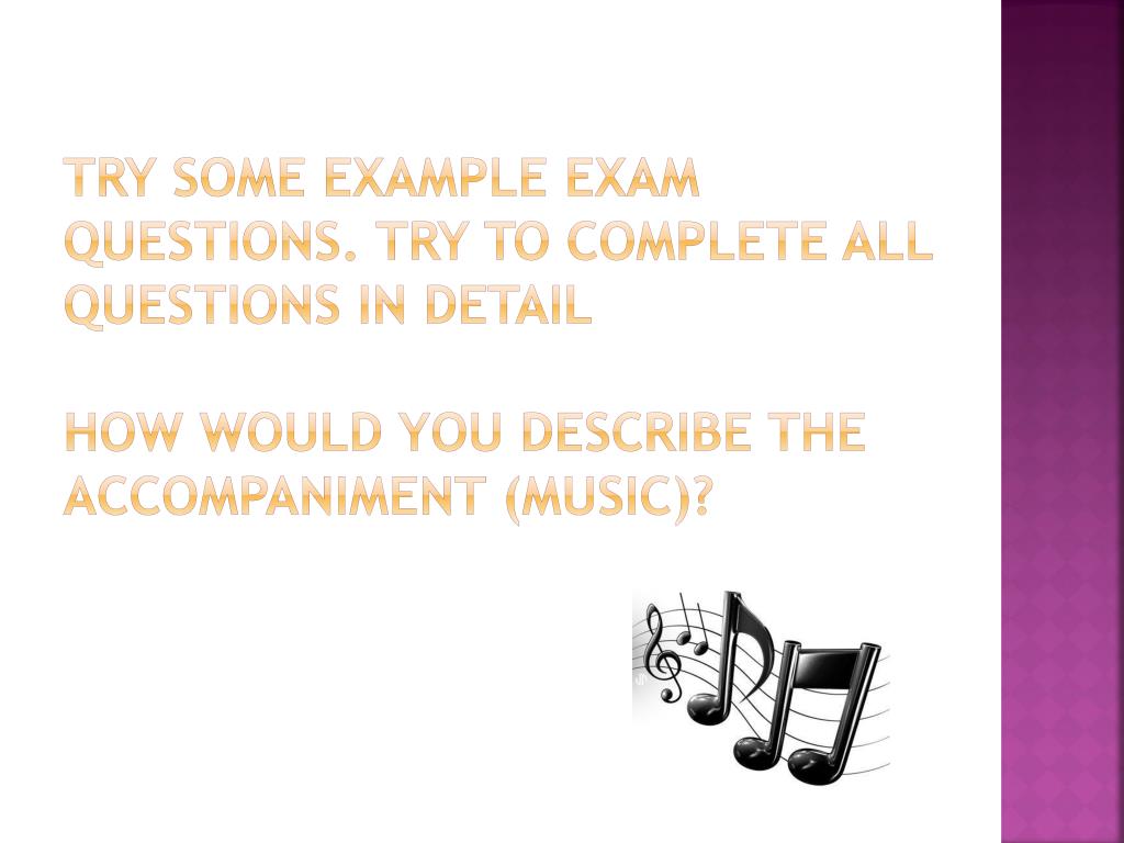 Try some example exam questions. Try to complete all questions in detailHow would you describe the accompaniment (Music)?