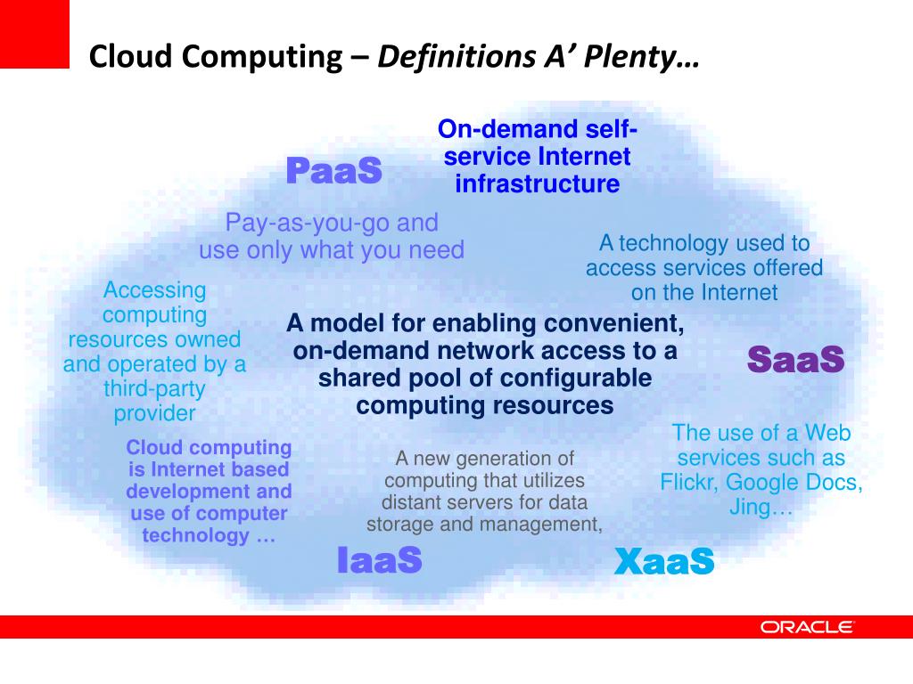 Cloud Computing – Definitions A’ Plenty… • On-demand self-service Internet infrastructure PaaS • Pay-as-you-go and use only what you need • A technology used to access services offered on the Internet • Accessing computing resources owned and operated by a third-party provider A model for enabling convenient, on-demand network access to a shared pool of configurable computing resources SaaS • The use of a Web services such as Flickr, Google Docs, Jing… • A new generation of computing that utilizes distant servers for data storage and management, • Cloud computing is Internet based development and use of computer technology … IaaS XaaS