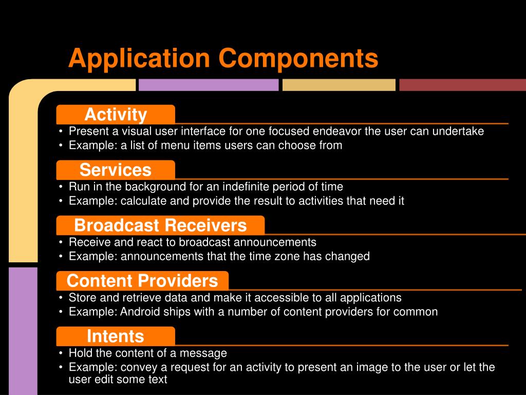 Services • Run in the background • Can continue even if Activity that started it dies • Should be used if something needs to be done while the user is not interacting with application • Otherwise, a thread is probably more applicable • Should create a new thread in the service to do work in, since the service runs in the main thread • Can be bound to an application • In which case will terminate when all applications bound to it unbind • Allows multiple applications to communicate with it via a common interface • Needs to be declared in manifest file • Like Activities, has a structured life cycle