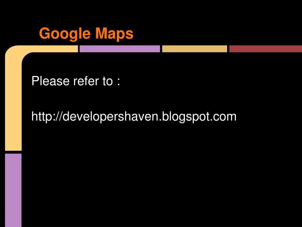 Resources & Acknowledgements • Installation: http://developershaven.blogspot.com • Google API: http://mfarhan133.wordpress.com/2010/10/01/generate-google-maps-api-key-for-android/ • Android Developer’s Website : http://developer.android.com/index.html • Numerous Forums & other developer sites, including: • http://www.javacodegeeks.com/2011/02/android-google-maps-tutorial.html • http://efreedom.com/Question/1-6070968/Google-Maps-Api-Directions • http://stackoverflow.com • http://www.anddev.org/google_driving_directions_-_mapview_overlayed-t826.html