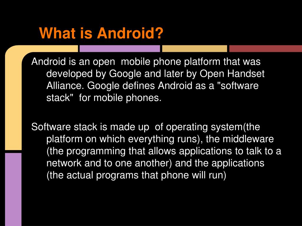 What is Android? Android is an open mobile phone platform that was developed by Google and later by Open Handset Alliance. Google defines Android as a "software stack" for mobile phones. Software stack is made up of operating system(the platform on which everything runs), the middleware (the programming that allows applications to talk to a network and to one another) and the applications (the actual programs that phone will run)