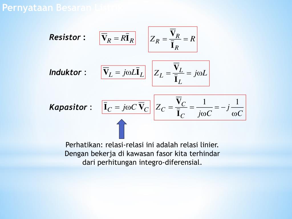PernyataanBesaranListrik Resistor: Induktor : Kapasitor : Perhatikan: relasi-relasiiniadalahrelasi linier. Denganbekerja di kawasanfasorkitaterhindardariperhitunganintegro-diferensial.