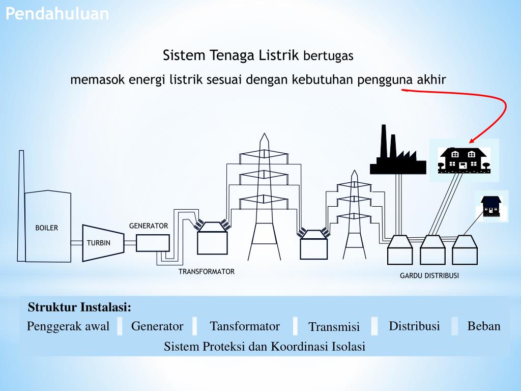 Pendahuluan StrukturInstalasi: Distribusi Beban Penggerakawal Generator Tansformator Transmisi Sistem Proteksi dan Koordinasi Isolasi GENERATOR BOILER TURBIN TRANSFORMATOR GARDU DISTRIBUSI SistemTenagaListrikbertugas memasokenergilistriksesuaidengankebutuhanpenggunaakhir