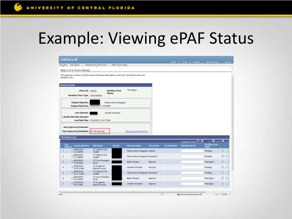 Status of ePAFs • View Status of ePAF • Go to Department Self-Service • ePAF Homepage • View an ePAF • Select ePAF Type (Hire, Edit Existing Job, etc.) • Input eform number or emplid and click search • Scroll Down to the bottom and click Next • It will show where the ePAF is in the workflow
