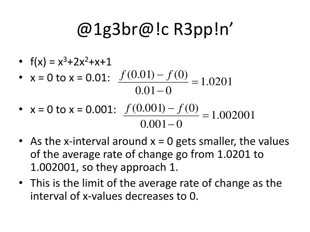 @1g3br@!c R3pp!n’ • f(x) = x3+2x2+x+1 • x = 0 to x = 0.01: • x = 0 to x = 0.001: • As the x-interval around x = 0 gets smaller, the values of the average rate of change go from 1.0201 to 1.002001, so they approach 1. • This is the limit of the average rate of change as the interval of x-values decreases to 0.