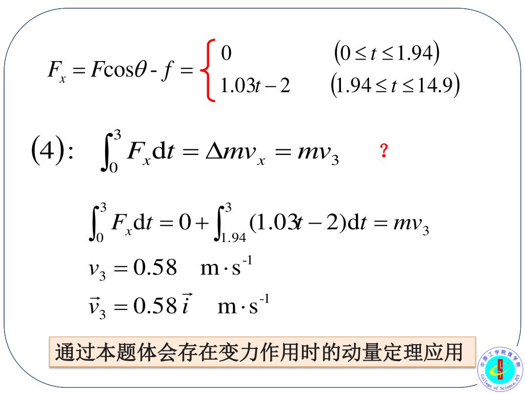 例3一颗子弹在枪筒里前进时所受的合力大小为F=400-4105t/3,子弹从枪口射出时的速率为300m/s。设子弹离开枪口处合力刚好为零。求:(1)子弹走完枪筒全长所用的时间t。(2)子弹在枪筒中所受力的冲量I。(3)子弹的质量。例3一颗子弹在枪筒里前进时所受的合力大小为F=400-4105t/3,子弹从枪口射出时的速率为300m/s。设子弹离开枪口处合力刚好为零。求:(1)子弹走完枪筒全长所用的时间t。(2)子弹在枪筒中所受力的冲量I。(3)子弹的质量。 解: (1) (2) (3)