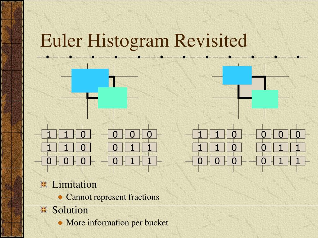 0 1 0 1 0 1 1 0 0 0 0 0 0 1 1 0 1 1 1 1 0 1 1 0 0 0 0 0 1 0 0 1 0 1 1 0 Euler Histogram Revisited • Limitation • Cannot represent fractions • Solution • More information per bucket