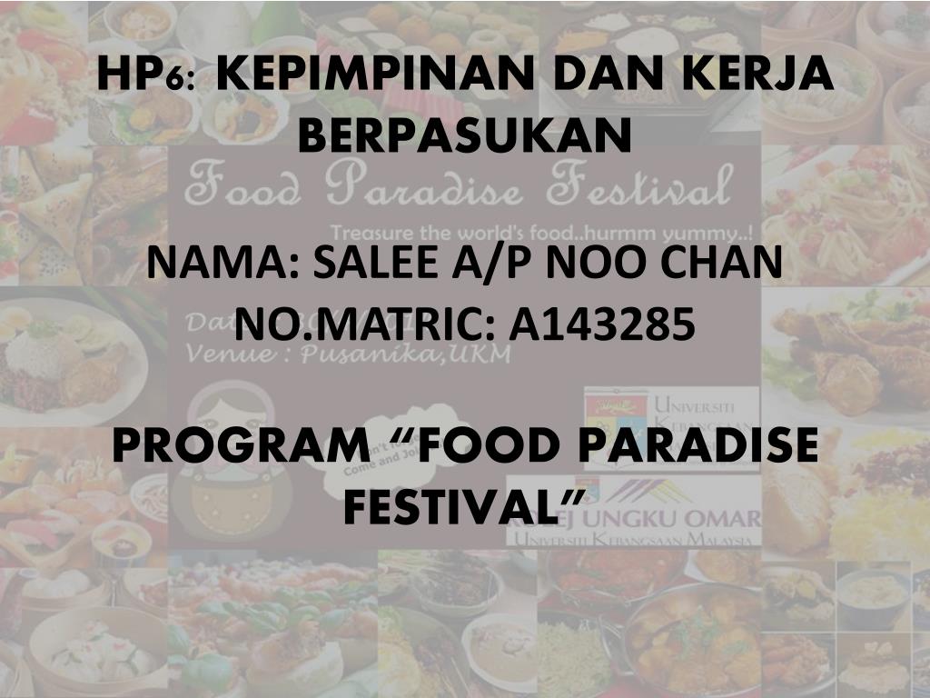 HP6: KEPIMPINAN DAN KERJA BERPASUKANNAMA: SALEE A/P NOO CHANNO.MATRIC: A143285PROGRAM “FOOD PARADISE FESTIVAL”