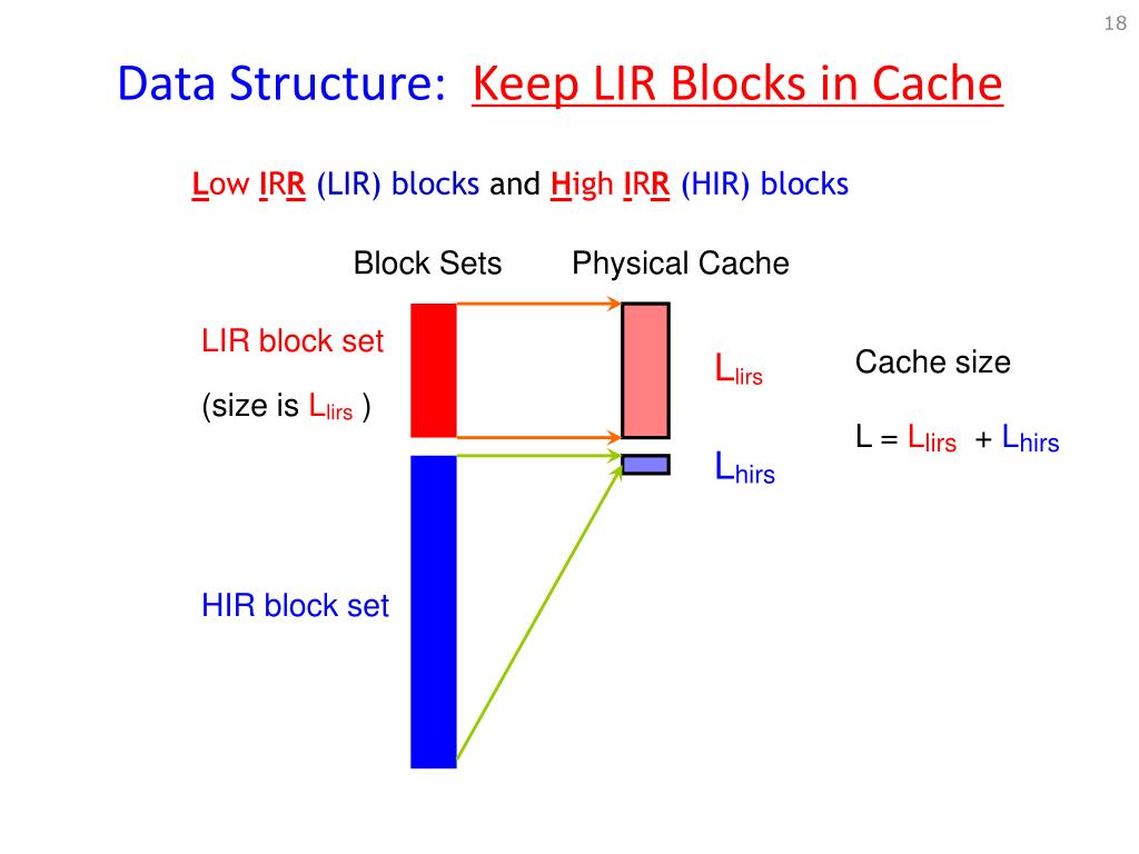 Llirs Lhirs Data Structure:Keep LIR Blocks in Cache Low IRR(LIR) blocks and High IRR (HIR) blocks Block Sets Physical Cache LIR block set (size is Llirs ) Cache size L =Llirs + Lhirs HIR block set