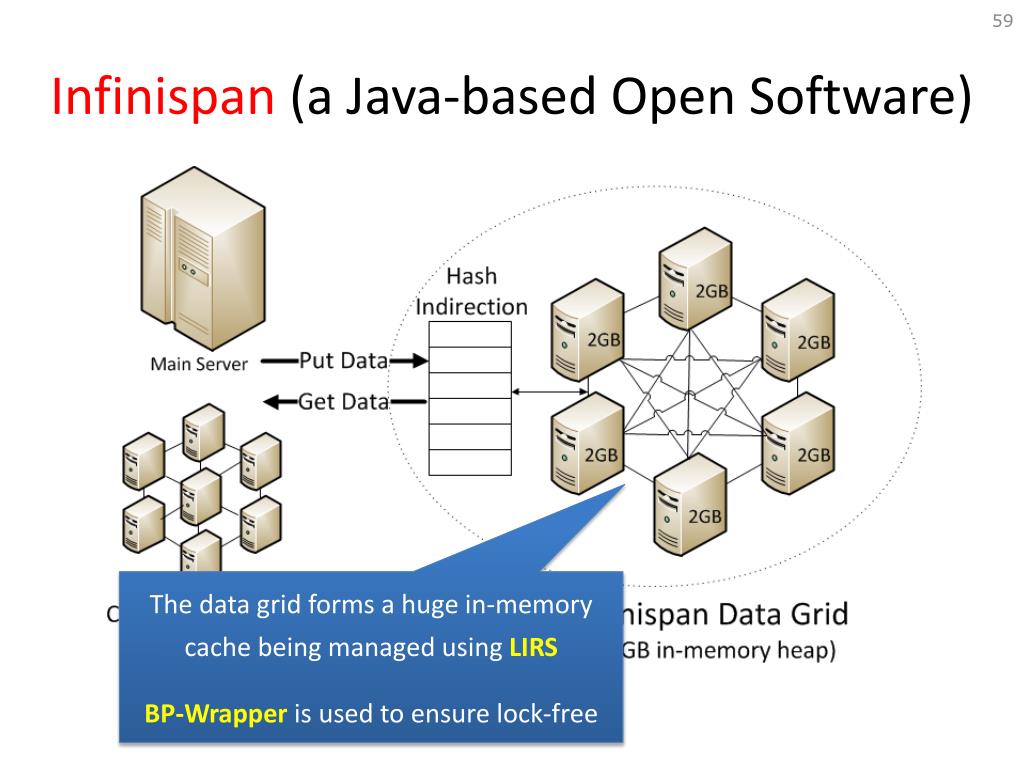 Infinispan (a Java-based Open Software) The data grid forms a huge in-memory cache being managed using LIRS BP-Wrapper is used to ensure lock-free