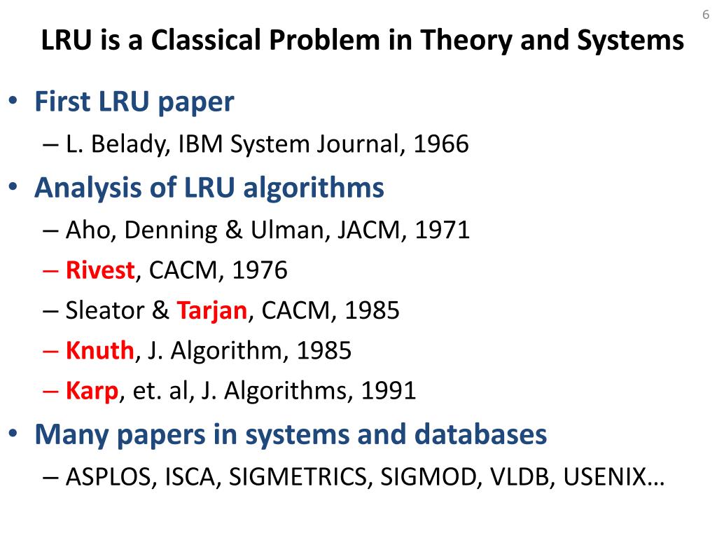 First LRU paper • L. Belady, IBM System Journal, 1966 Analysis of LRU algorithms • Aho, Denning & Ulman, JACM, 1971 • Rivest, CACM, 1976 • Sleator & Tarjan, CACM, 1985 • Knuth, J. Algorithm, 1985 • Karp, et. al, J. Algorithms, 1991 Many papers in systems and databases • ASPLOS, ISCA, SIGMETRICS, SIGMOD, VLDB, USENIX… LRU is a Classical Problem in Theory and Systems