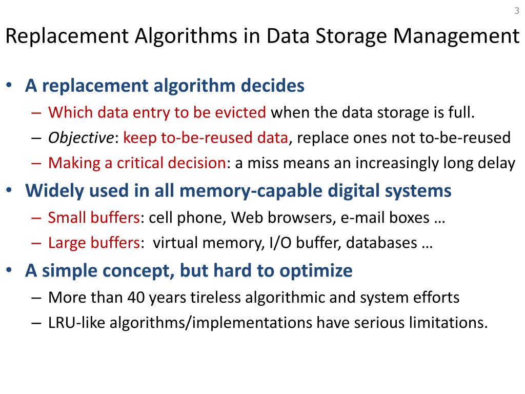 A replacement algorithm decides • Which data entry to be evicted when the data storage is full. • Objective: keep to-be-reused data, replace ones not to-be-reused • Making a critical decision: a miss means an increasingly long delay Widely used in all memory-capable digital systems • Small buffers: cell phone, Web browsers, e-mail boxes … • Large buffers: virtual memory, I/O buffer, databases … A simple concept, but hard to optimize • More than 40 years tireless algorithmic and system efforts • LRU-like algorithms/implementations have serious limitations. Replacement Algorithms in Data Storage Management