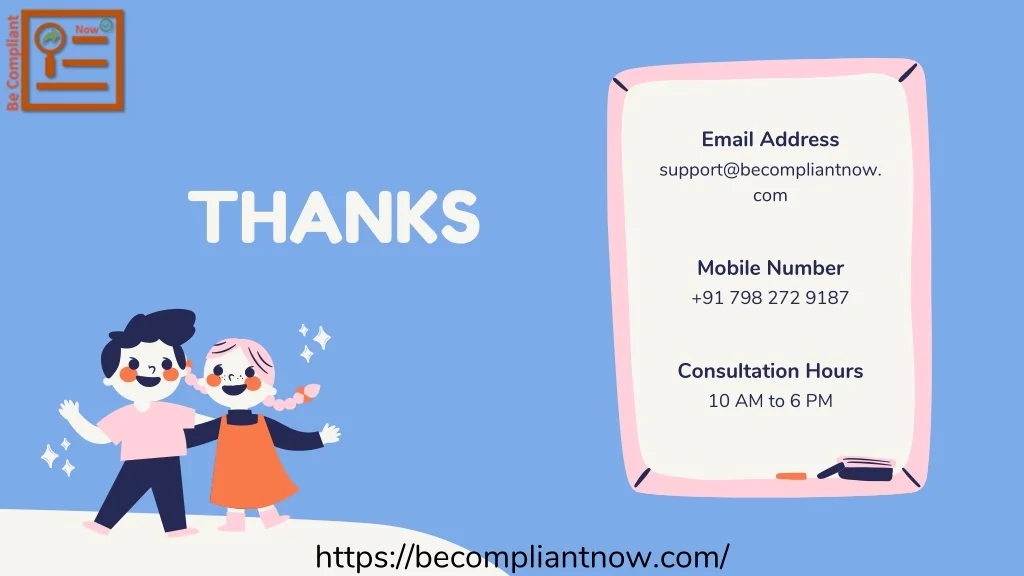 Email Address support@becompliantnow. com THANKS Mobile Number +91 798 272 9187 Consultation Hours 10 AM to 6 PM https://becompliantnow.com/
