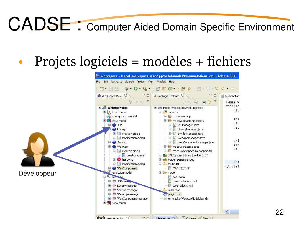 CADSE : Computer Aided Domain SpecificEnvironment Développeur Projets logiciels = modèles + fichiers