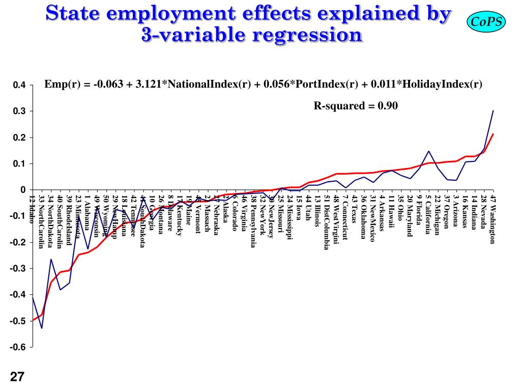 State employment effects explained by 3-variable regression Emp(r) = -0.063 + 3.121*NationalIndex(r) + 0.056*PortIndex(r) + 0.011*HolidayIndex(r) R-squared = 0.90
