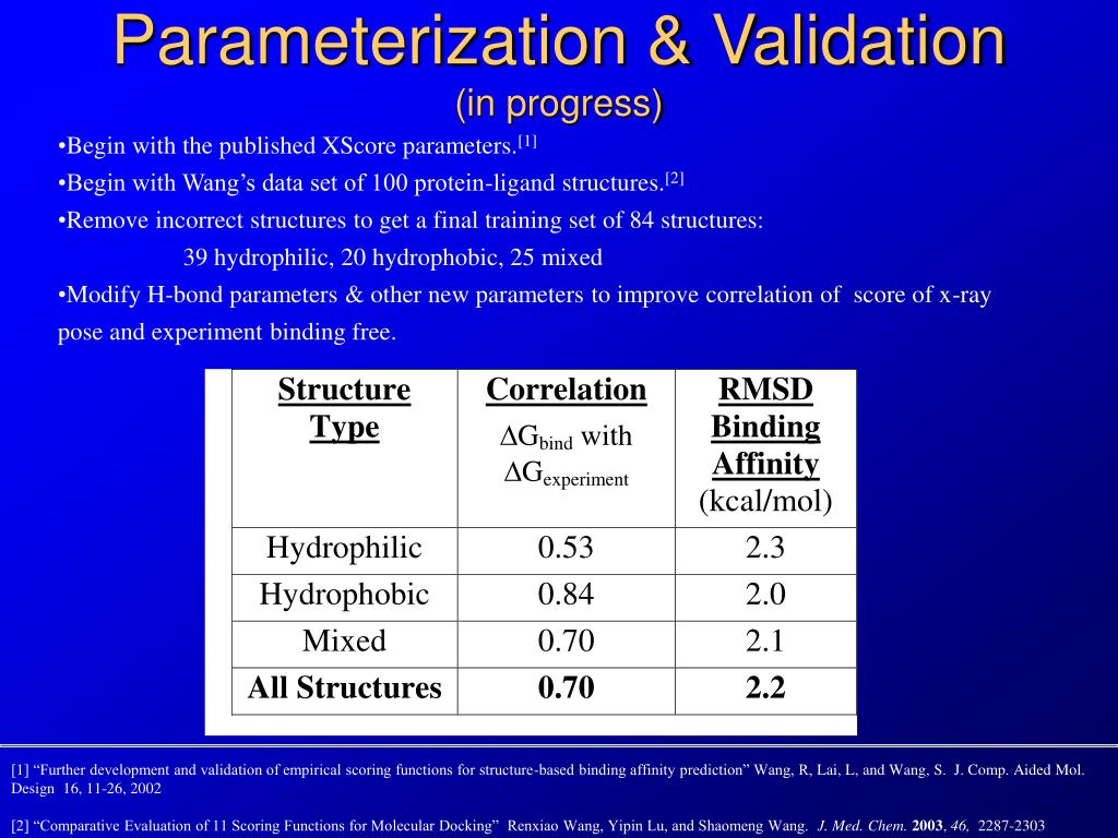 Parameterization & Validation(in progress) • Begin with the published XScore parameters.[1] • Begin with Wang’s data set of 100 protein-ligand structures.[2] • Remove incorrect structures to get a final training set of 84 structures: • 39 hydrophilic, 20 hydrophobic, 25 mixed • Modify H-bond parameters & other new parameters to improve correlation of score of x-ray pose and experiment binding free. [1] “Further development and validation of empirical scoring functions for structure-based binding affinity prediction” Wang, R, Lai, L, and Wang, S. J. Comp. Aided Mol. Design 16, 11-26, 2002 [2] “Comparative Evaluation of 11 Scoring Functions for Molecular Docking” Renxiao Wang, Yipin Lu, and Shaomeng Wang. J. Med. Chem.2003, 46, 2287-2303