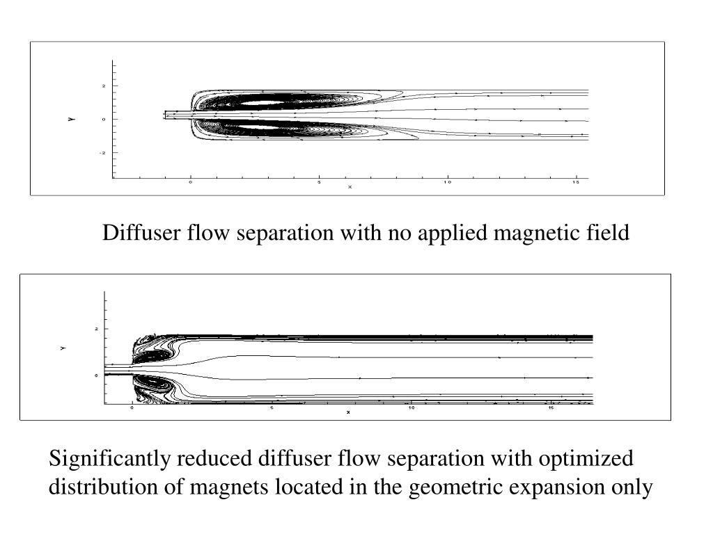 Diffuser flow separation with no applied magnetic field Significantly reduced diffuser flow separation with optimized distribution of magnets located in the geometric expansion only