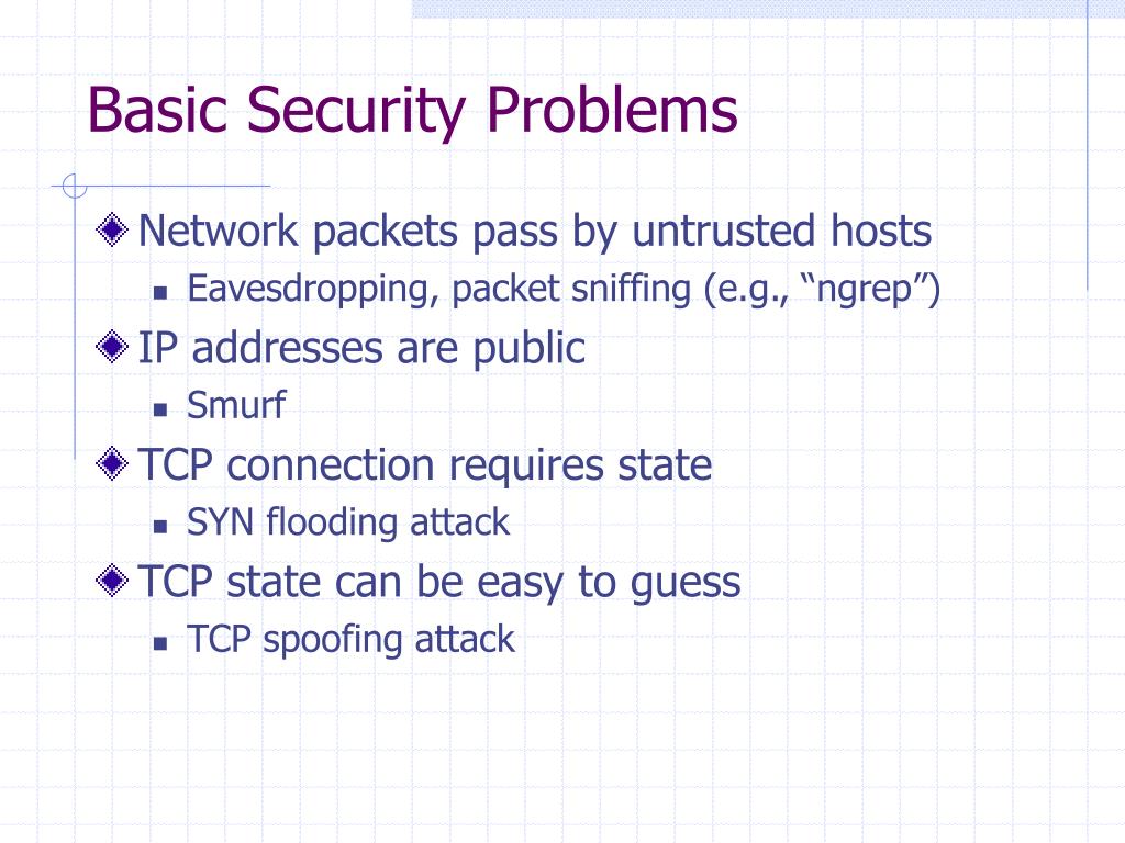 Basic Security Problems • Network packets pass by untrusted hosts • Eavesdropping, packet sniffing (e.g., “ngrep”) • IP addresses are public • Smurf • TCP connection requires state • SYN flooding attack • TCP state can be easy to guess • TCP spoofing attack