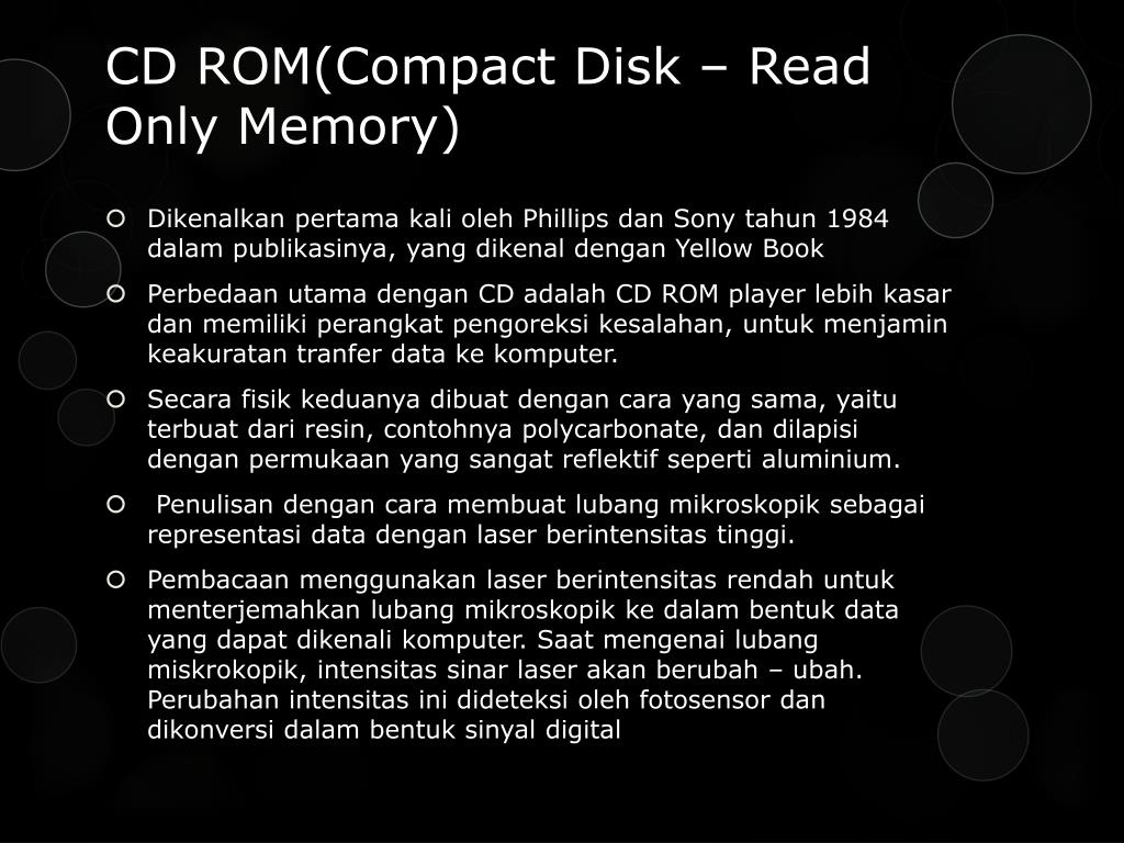 CD ROM(Compact Disk – Read Only Memory) • Dikenalkan pertama kali oleh Phillips dan Sony tahun 1984 dalam publikasinya, yang dikenaldengan Yellow Book • Perbedaanutamadengan CD adalah CD ROM player lebihkasardan memiliki perangkat pengoreksi kesalahan, untuk menjamin keakuratantranfer data kekomputer. • Secarafisikkeduanyadibuatdengancara yang sama, yaituterbuatdari resin, contohnya polycarbonate, dan dilapisi dengan permukaanyang sangatreflektifsepertialuminium. • Penulisandengancaramembuatlubangmikroskopiksebagairepresentasidata dengan laser berintensitastinggi. • Pembacaanmenggunakan laser berintensitasrendahuntukmenterjemahkanlubangmikroskopikkedalambentuk data yang dapatdikenalikomputer. Saatmengenailubangmiskrokopik, intensitassinar laser akanberubah – ubah. Perubahanintensitasinidideteksiolehfotosensordandikonversidalambentuksinyal digital