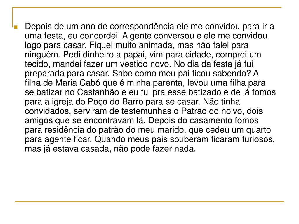 Depois de um ano de correspondência ele me convidou para ir a uma festa, eu concordei. A gente conversou e ele me convidou logo para casar. Fiquei muito animada, mas não falei para ninguém. Pedi dinheiro a papai, vim para cidade, comprei um tecido, mandei fazer um vestido novo. No dia da festa já fui preparada para casar. Sabe como meu pai ficou sabendo? A filha de Maria Cabó que é minha parenta, levou uma filha para se batizar no Castanhão e eu fui pra esse batizado e de lá fomos para a igreja do Poço do Barro para se casar. Não tinha convidados, serviram de testemunhas o Patrão do noivo, dois amigos que se encontravam lá. Depois do casamento fomos para residência do patrão do meu marido, que cedeu um quarto para agente ficar. Quando meus pais souberam ficaram furiosos, mas já estava casada, não pode fazer nada.