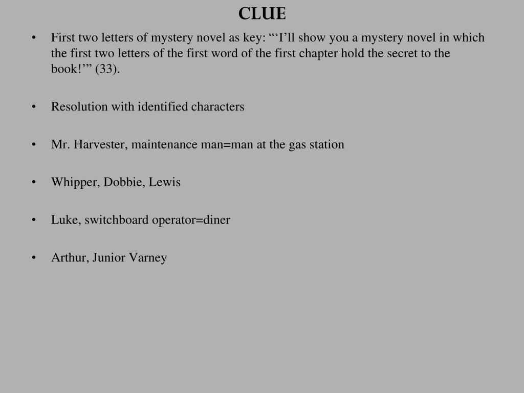 CLUE • First two letters of mystery novel as key: “‘I’ll show you a mystery novel in which the first two letters of the first word of the first chapter hold the secret to the book!’” (33). • Resolution with identified characters • Mr. Harvester, maintenance man=man at the gas station • Whipper, Dobbie, Lewis • Luke, switchboard operator=diner • Arthur, Junior Varney