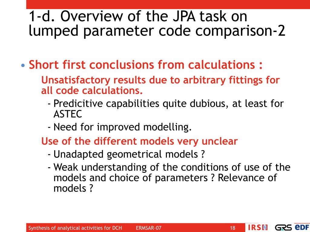1-d. Overview of the JPA task on lumped parameter code comparison-2 • Short first conclusions from calculations : • Unsatisfactory results due to arbitrary fittings for all code calculations. • Predicitive capabilities quite dubious, at least for ASTEC • Need for improved modelling. • Use of the different models very unclear • Unadapted geometrical models ? • Weak understanding of the conditions of use of the models and choice of parameters ? Relevance of models ?