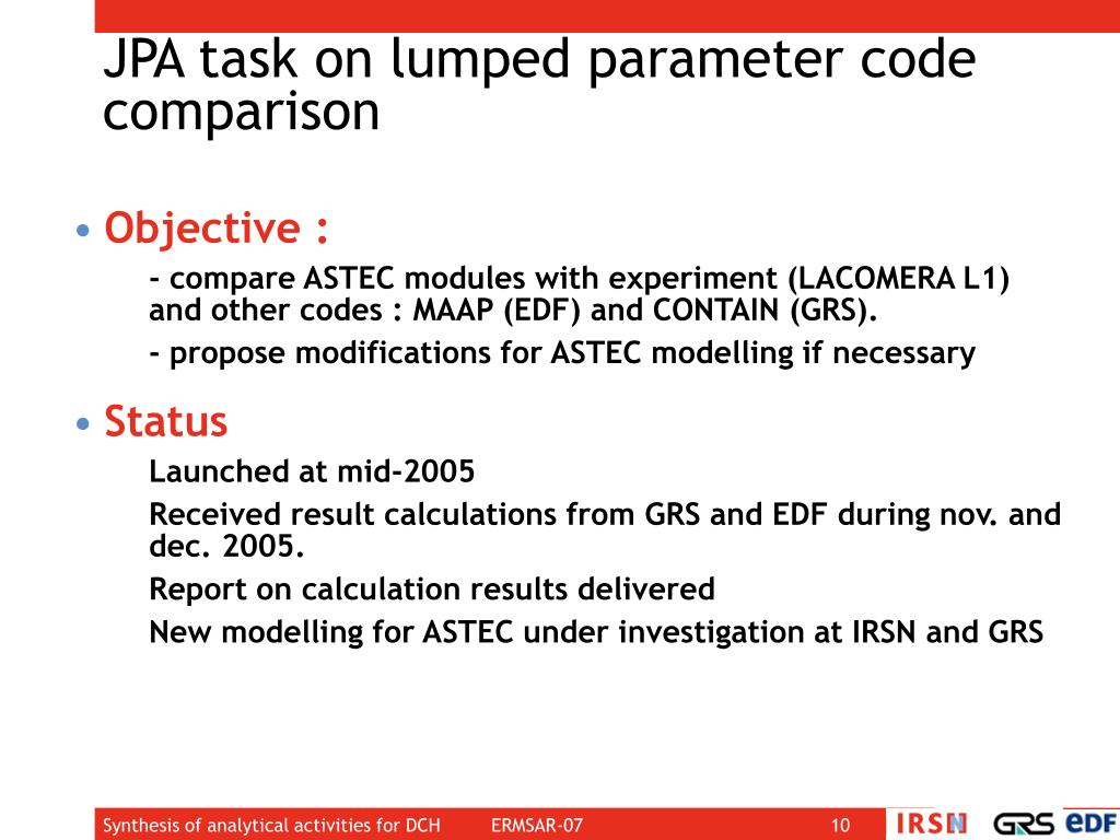 JPA task on lumped parameter code comparison • Objective : • - compare ASTEC modules with experiment (LACOMERA L1) and other codes : MAAP (EDF) and CONTAIN (GRS). • - propose modifications for ASTEC modelling if necessary • Status • Launched at mid-2005 • Received result calculations from GRS and EDF during nov. and dec. 2005. • Report on calculation results delivered • New modelling for ASTEC under investigation at IRSN and GRS