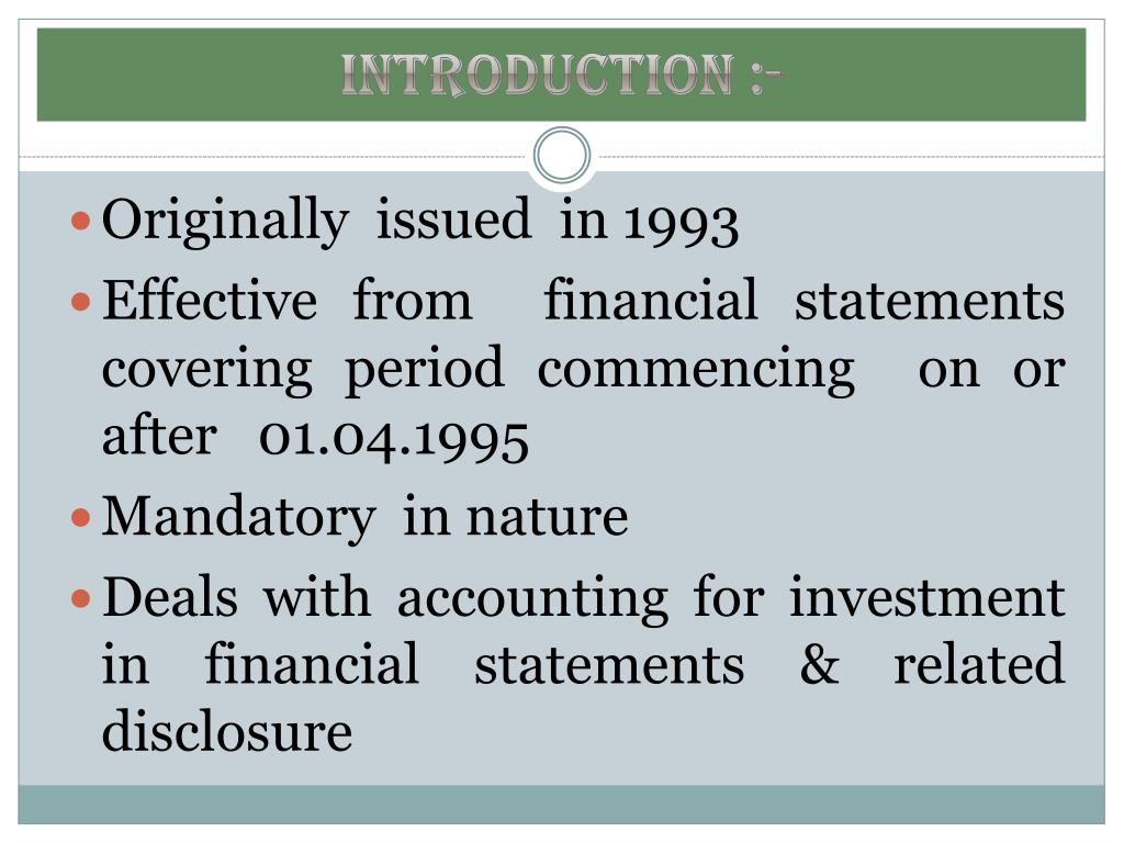 Introduction :- Originally issued in 1993 Effective from financial statements covering period commencing on or after 01.04.1995 Mandatory in nature Deals with accounting for investment in financial statements & related disclosure